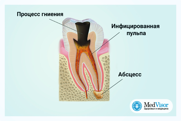 Кариес. Небольшие каверны от кариеса – тоже идеальное место для размножения микробов. Постепенно дырок будет становиться больше, пока зуб полностью не сгниет. Лучше не дожидаться, пока кариес перейдет в пульпит, а сразу же поставить пломбу;